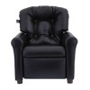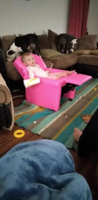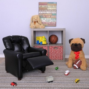 The Crew Furniture Traditional Kids Recliner Chair Faux Leather was designed especially for little kids. That's why they love relaxing in it to watch their favorite TV shows and reclining it for an afternoon snooze. This sturdy, environmentally friendly chair is constructed of engineered wood and cushioned with recycled polyester fiber batting. Upholstered with polyurethane faux leather, it's luxuriously comfortable and super easy to keep clean. The rolled arms and stitched button tufted back is reminiscent of traditional button tufted adult chairs, but safer for little kids. Our tufting is made with circle stitches instead of actual buttons to eliminate the choking hazard which can occur when buttons fall off. Pushing back on the arms while seated in the chair reclines the seat and back and extends the footrest. An adult should assist toddlers with the push-back reclining function and return the footrest to the retracted position when not in use. So gather your little crew and give them a chair of their own. It's sure to put a smile on their faces and warm their hearts - and yours.