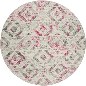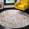 The rug features a striking ivory and pink color palette, with a distinctively distressed geometric pattern that brings a contemporary yet timeless charm to any room. Its unique round shape makes it an ideal centerpiece for living areas, bedrooms, or under round tables, accentuating the design motif and bringing coherence to your decor scheme.