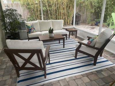 Perfect solution for our covered porch — durable frames that can withstand occasional weather and exposure, and comfortable firm cushions. The assembly process is simple and straightforward, using only the hex-drive supplied with the furniture.