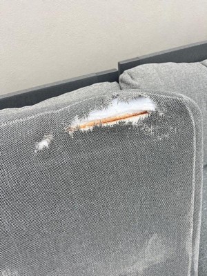 Hello Kathy, I'm sorry to hear about the tear in one of your cushions. Please reach out via the help center, with your order information and pictures and the customer service team will help you. https://help.polywood.com/hc/en-us?_gl=1*glphmq*_ga*MzMzODM1MjYyLjE2OTQ2MTgxMjk.*_ga_05HSBS0Y5X*MTcwNDQ3NzMyNy4xNTguMS4xNzA0NDc3Mzc5LjguMC4w Thanks, Mindy