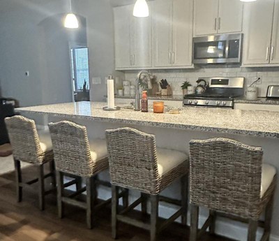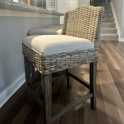 Add a touch of texture and comfort to your kitchen or bar area with our elegant counter stool. Expertly crafted from solid wood, this stool features a wicker rattan seat frame and a camelback-shaped backrest, providing both visual appeal and sturdy support. The plump seat cushion is designed to offer superior comfort, making it perfect for enjoying a morning coffee or working at your laptop. With a space-saving design, simply push the stool under the counter when not in use. Best of all, it arrives at your door fully assembled, ready for immediate use.