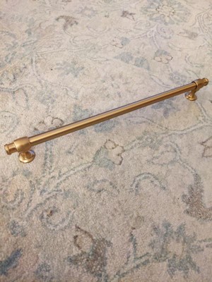 [This review was collected as part of a promotion.] The color of this is pretty muted, as far as golds go, which isn't a bad thing - it doesn't quite match what I have going on in my kitchen right now, though, so instead of using it as a large drawer or cabinet pull, I added it to the outer side panel of a smaller mint green credenza I use as a liquor/bar cabinet and it's actually working well for me as a dish towel bar. I found the installation really easy to figure out with the included instructions, and it's a very solid, very heavy, quality looking fixture.