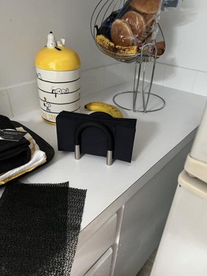 This napkin holder is perfect, it's adjustable to make smaller when you use up napkins, so there is no more flopping over of napkins in other "traditional" holders, or needing to keep those full 100% of the time! The best. It's a great contemporary design, very simple, and the black part is a bit rubbery so that napkins don't slip out. The bottom also does not scratch surfaces (has little pads). Didn't think I could love a napkin holder, but I do.