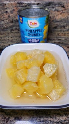 Dole pineapple chunks in 100% pineapple juice are fresh, juicy, and delicious. The texture is firm with an authentic flavor. Perfect for desserts, salads , or enjoying straight from the can. Convenient size and excellent overall quality.