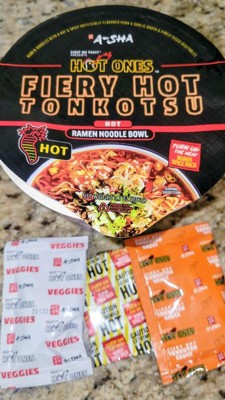 [This review was collected as part of a promotion.] Hot ones is a fitting name! Cups of noodles like this are pretty common, I've always enjoyed them so I was excited to try a new one. I also like spicy so this was perfect. Ut can be cooked on a stove or a microwave, I chose microwave for ease of use. I added the hot sauce and veggies as instructed and then filled the water to the full line. At least I think, the full line was had to see is on the outside, not the inside. I had a hard time seeing it. Anyway, 3 minutes later I had my test to eat soup so I got my chop sticks out and had at it. Wow my mouth was on fire in second, yes this was without the extra heat! The taste is nice but you'll be hurting from heat while you enjoy it. What of the extra heat? I did try adding some layer and I was to far gone to notice it, but I don't doubt them that it is even hotter. The broth will remain watery and turns a dark brown. I ate this all with chopsticks but a spoon or fork combo will do too. Not bad at all for spice lovers. I liked the taste, and the spice maybe a tick above my tolerance level. I can try using less sauce to to accommodate. Give this one a try!
