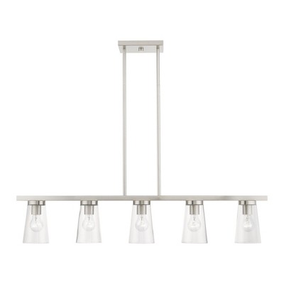 Collection: Cityview, Material: Steel, Finish Color: Brushed Nickel, Width: 4.75", Height: 14.25", Length: 30", Hanging Method: Stem, Lamping Type: Incandescent, Number Of Bulbs: 3, Wattage: 180 Watts, Moisture Rating: Dry Rated, Desc: Illuminate your home with a bright design from the Cityview collection. This three-light down linear chandelier features a black finish with brushed nickel finish accents and clear glass. Perfect for a contemporary or transitional luxury kitchen or dining room setting.,