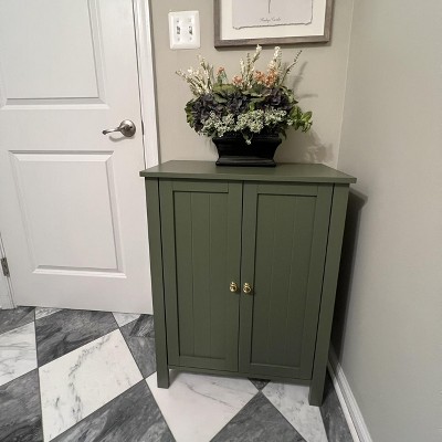 Cute cabinet. The green color is lovely. Took about an hour to put together. It's particle board with a paint overlay but looks adorable and fairly sturdy. Perfect for bathroom storage. Two adjustable shelves inside. Neutral enough to fit in a variety of decors. Love it.