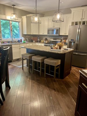 I was so tired of the heavy metal framed kitchen stools that were difficult to move to clean under. They also took up too much floor space in a high traffic area. These seagrass stools are perfect for both the ease in moving them to clean the floor as well as fitting completely under the counter to keep the traffic area open