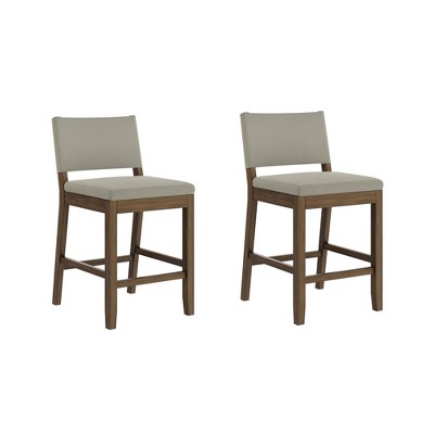 The Linus solid wood modern counter height bar chair has got your back (literally) covered. The bar stool has a thick, durable cushion upholstered in a high-quality birch ivory polyester fabric, and highlights an elegant grey faux leather backrest. The wire-brushed dark brown counter stool is crafted with sturdy rubberwood legs and holds up to 300 pounds, plenty for holding you and that extra glass of wine after work. It has a built-in footrest so you can enjoy each snack in complete comfort. This timeless counter stool will seamlessly blend in with your modern farmhouse home, and the best part: it takes only 15 minutes to assemble!