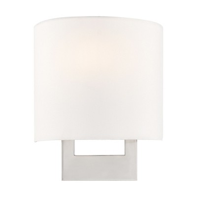 Collection: Hayworth, Material: Steel, Finish Color: Brushed Nickel, Width: 11", Height: 12", Depth: 3.95", Height From Outlet Box: 6.5", Backplate Width: 4.75", Backplate Length: 11.25", Lamping Type: Incandescent, Number Of Bulbs: 1, Wattage: 40 Watts, Moisture Rating: Dry Rated, Desc: Raise the style bar with a designer wall sconce in a handsome and versatile contemporary manner. This one light wall sconce comes in a brushed nickel finish with a rectangular off-white fabric hardback shade.,