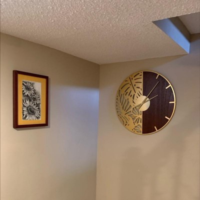 Transform your living space with our captivating wall clock, a fusion of sophisticated design and practical functionality. Crafted with meticulous attention to detail, this timepiece features a harmonious blend of rich brown wood and lustrous gold metal. The intricate leaf cutouts add an extra layer of elegance, making it a stunning focal point in any room. Designed for versatility, this clock seamlessly fits into various settings, from entryways to offices, living rooms, bedrooms, and kitchens. Its unique aesthetic effortlessly complements both modern and traditional interiors, offering a timeless and chic addition to your home decor. The slim 2" depth ensures that the clock sits gracefully against your wall, creating a tasteful and eye-catching display. As each passing moment is marked by the clock's precision, it becomes more than just a timekeeping instrument; it becomes a work of art that enhances the ambiance of your surroundings. Immerse yourself in the intersection of form and function, where time becomes an integral part of your home's aesthetic.