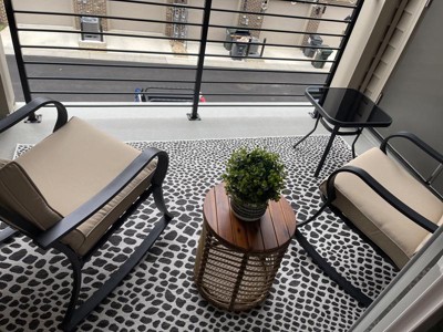 Extremely pleased with my rug. The black and off-white color within the pattern adds interest and subtle pop. Holds up well in the rain.