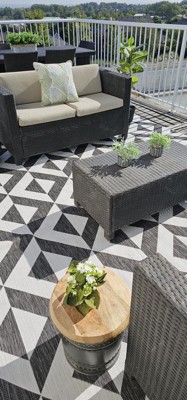 EASY CARE: For an outdoor rug, remove debris frequently with the use of a broom or blower. To wash, spray the surface with a soap and water mixture, then rinse thoroughly with a garden hose and hang over a railing to dry thoroughly. Rotate for even wear.