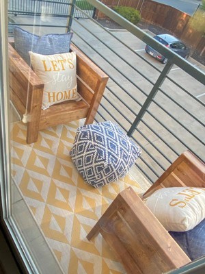 I purchased this rug as accent to my small boutique patio and it gave the perfect lift. The colors and design complement the other furniture and wraps ups perfect setting to enjoy an evening glass of wine.