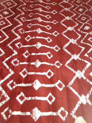 Purchase rug before Christmas. The Rug was tightly wrapped, and took several days to flatten the rug. However, this rug is very true to the photo. Loved the bright bold red rug with the white pattern. Amazing look, especially during the holidays.
