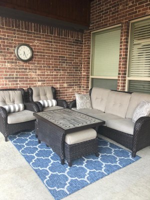 I was looking for an outdoor rug that could withstand water as we have a pool near our patio. We had a different rug which molded quickly. We’ve only had this rug for about a month and haven’t had any issues. Light weight and easy to keep clean so far. Will come back and update should things change. Love the blue and pattern on it!