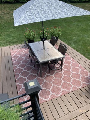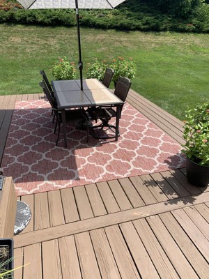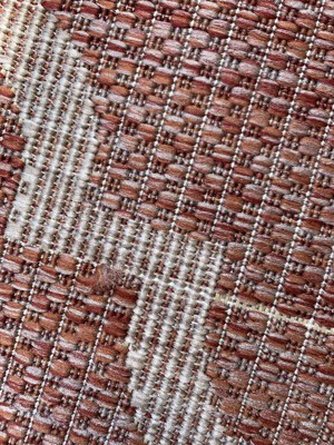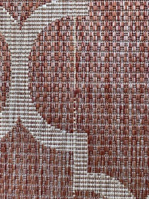 We wanted something under the dining table on our lower deck to match the rust colored cushions in the seating area on our upper deck. This rug matched perfectly and even gives a weathered appearance so it blends in nicely. The rug is a full 9’ x 12’, which is perfect under the table; it leaves plenty of space to pull the chairs out without going over the edge. We also love the fact that it is thin, which made it easy to carry and helps it dry out after a rainstorm. Unfortunately, the rug has several noticeable defects. They seem like pulls or perhaps just places where the weaving is poorly done. The rug was inexpensive and we’re using it outdoors so the flaws are disappointing but not worth the effort it would take to repackage the rug and ship it back. If we wanted it for a porch or sunroom, we would probably return it.