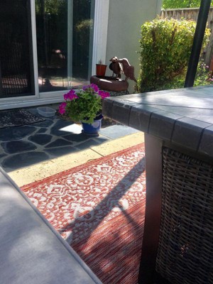 EASY CARE: For an outdoor rug, remove debris frequently with the use of a broom or blower. To wash, spray the surface with a soap and water mixture, then rinse thoroughly with a garden hose and hang over a railing to dry thoroughly. Rotate for even wear.