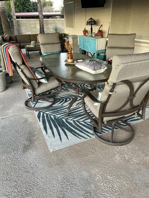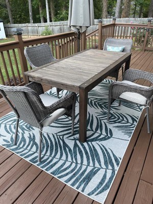 A: The rug features a botanical palm floral design, adding a decorative touch to outdoor spaces.