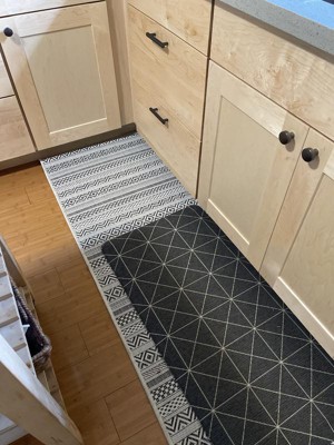 Nice looking rug. The pattern is beautiful. Reminiscent of mud cloth. The “ beige” looks black and white, not an issue for me though. It’s in front of my kitchen sink so the ends aren’t a tripping problem. I’m sure they’ll settle down eventually.