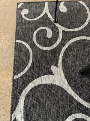 I bought this rug for an new screened in patio and so pleased with my purchase. It comes folded but lays flat quickly. Very easy to clean. Design is beautiful. A very dark gray. Highly recommend. Shipping was fast also! Still waiting on my patio furniture to arrive but I feel sure it will look great together.