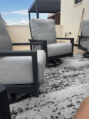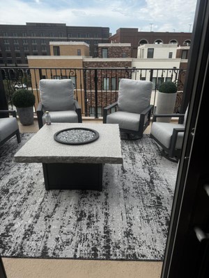A: The rug features an abstract design, perfect for enhancing outdoor spaces.