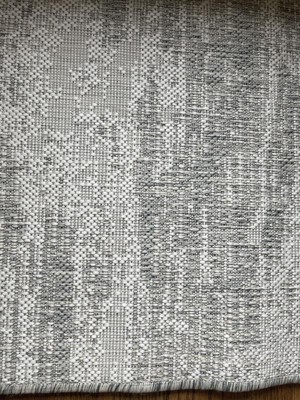 The gray rug is pretty. It is light ivory mixed with a little darker ivory, with gray intermingled with a tiny bit of darker gray. The textured look is nice. I bought this runner to go outside my front door, but it is also a rug I would consider using inside. It is a classy looking rug. Hard to capture in a photo.