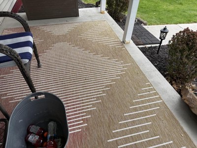 EASY CARE: For an outdoor rug, remove debris frequently with the use of a broom or blower. To wash, spray the surface with a soap and water mixture, then rinse thoroughly with a garden hose and hang over a railing to dry thoroughly. Rotate for even wear.