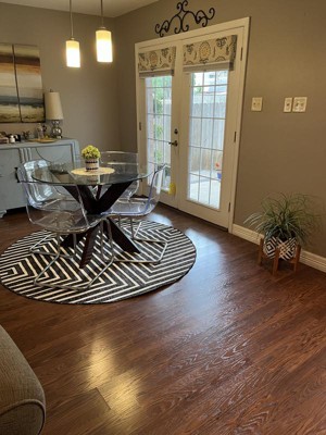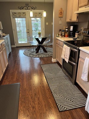 I absolutely LOVE my round modern crisp clean look in my little dining area. This is exactly what I had been looking for for years. Just didn’t know the description was abstract geometric modern design. Also purchased the runners that compliment and complete the sharp look. Thank you.