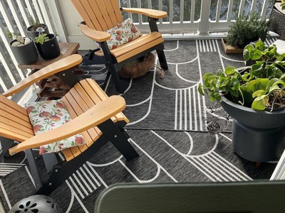 I have a very awkwardly shaped outdoor area which I wanted fully covered. As a result I had to buy 4 different sizes of this carpet to get complete coverage. I am happy with the end result. The geometric lines and bold deep color creates a stunning canvas to lay out a beautiful space. Although the space is screened in, it is subject to some weather so having this type of carpet is essential. Beautiful +high quality = Winning combination!