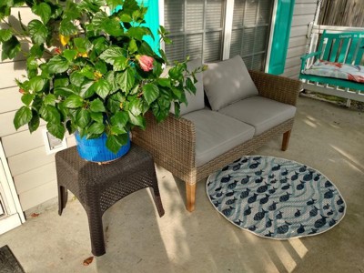 [This review was collected as part of a promotion.] Put this rug out in our small front patio area. I love the design, its so bright and happy - the blue blends in well with the rest of the decor. The material seems sturdy and easy to clean and it doesn't seem like dust will damper the look of the rug.