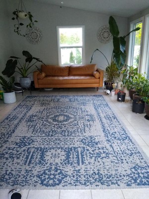 So this rug is sitting in a sunroom which leads to our pool. The plants need to be arranged a little better and I need bamboo curtains. Overall I love this look. Perfect!