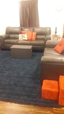 First we painted the basement floor light blue. Then we bought the perfect dark shag rug to cover the center of the rectangle, 8' x 11'. Off to the side, washer, dryer, sink & ironing board establish the new "wash room", au enlightened floor. Whereas, over the rug side, a treadmill & new bench press under windows make workouts fun, and music makes yoga or "Insanity" cardio addictive on the plushness of new, soft shag. Remake your rooms!