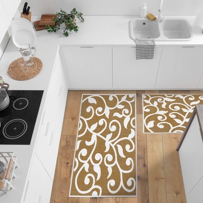Non Skid Washable Kitchen Runner Rug Set of 2 - 70 % Cotton Kitchen Floor Mat[Fascino-Beige]