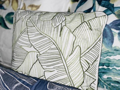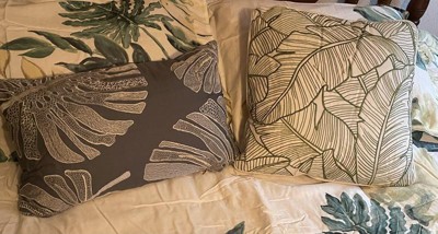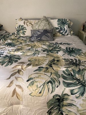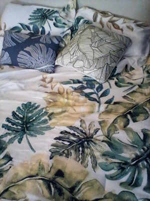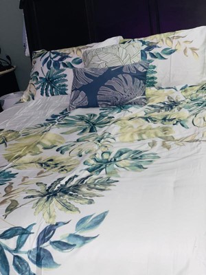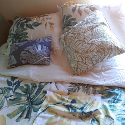[This review was collected as part of a promotion.] First off, I love the pattern and colors on this comforter. It is seriously stunning, so beautiful. The bed set was packaged extremely well and easy to unbox. The two included pillows are cute also. The whole bed set makes me happy, the cheerful leaves design, the blues, the greens. It's soft and comfortable. I love it so much. Delighted!