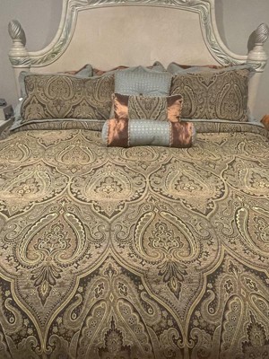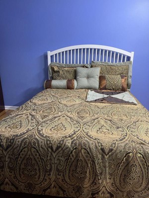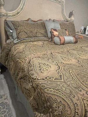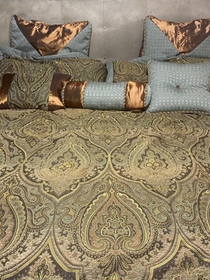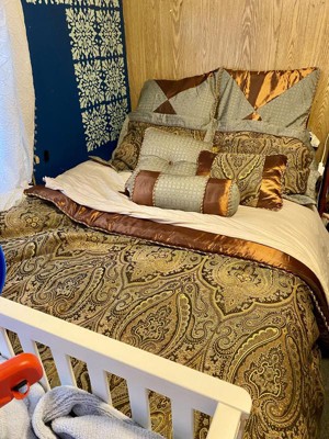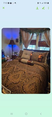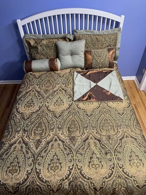 [This review was collected as part of a promotion.] I am so happy with the look and feel of the Canovia Springs 10 Piece Jacquard Comforter Set. This set brings a difference level on comfort and elegance to your bedroom. The beautiful, soft and warm golds and brown colors are perfectly matched with the silk underside of the comforter that provides a sense of cooling. This comforter is very heavy in weight, so that it does not slide off the bed, the decorator pillows provide the finishing touch to the set.