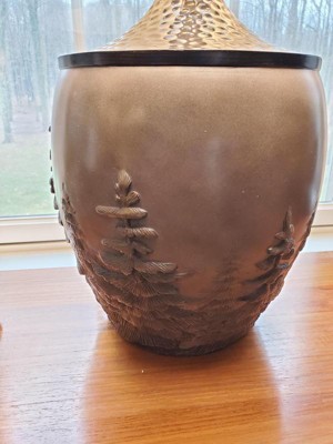 • Green fir tree pattern set against an lighter background. Antique copper finish accents at the neck. Hand-tinted cast resin construction, colors may vary slightly.