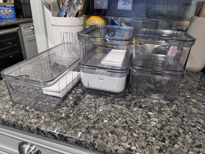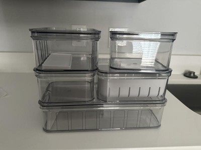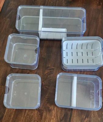 I love the idea of the iDESIGN 5 piece recycled plastic organizer set but I wish I would have read on the product that they are hand-wash only. I now have 2 deformed containers and lids. These bins work great for storing your washed and ready to eat produce. I also like how the one container has a removable strainer.