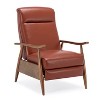 A clean classic recliner in top-grain leather is what you get with the Fairview wood arm push back chair. Featuring chestnut brown wood arms with tapered legs this comfortable recliner adds a modern look to any room. The top grain leather is aniline-dyed and contributes to the outstanding comfort of this recliner.