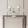 Collection: Lansdale, Material: Steel, Finish Color: Brushed Nickel, Width: 13.5", Height: 7", Depth: 3.75", Height From Outlet Box: 4.5", Backplate Width: 5", Backplate Length: 1", Lamping Type: Incandescent, Number Of Bulbs: 2, Wattage: 60 Watts, Moisture Rating: Dry Rated, Desc: Clean lines and exposed bulb sockets make the Lansdale collection�perfect for your mid-mod or transitional bath. The eclectic look is perfect for spaces wanting an urban, minimalistic or industrial touch. With superb craftsmanship and affordable price, this brushed nickel two-light vanity sconce is sure to tastefully indulge your extravagant side.,