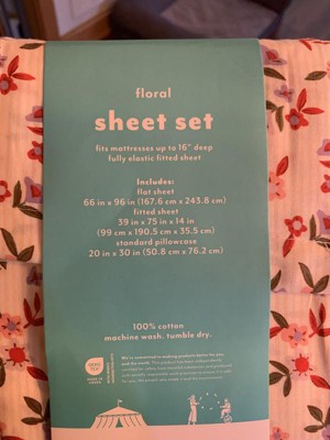 Bring garden-inspired freshness to your child’s sleeping space with this Ditzy Flower Cotton Sheet Set from Pillowfort™. This three-piece bedding set includes one fitted sheet, one flat sheet, and a matching pillowcase, all adorned with a colorful ditzy floral print. Each piece is crafted from 100% cotton for a soft feel and lasting comfort, and they can be tossed in the washing machine for hassle-free cleaning.