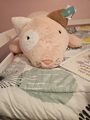 My son is obsessed with this extra large kitty. It is very very soft and just so cuddly. When I gave it to my son he squealed and has been sleeping with it ever since it’s the great little cuddle, buddy pillow with many uses and again did I mention how soft it is!!!! I find myself petting it because it’s just very silky and smooth. It is also very large and perfect for them to snuggle with and maybe take a nap :). Any child will love this accessory for their bedroom or just to a cuddle with.