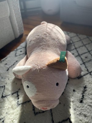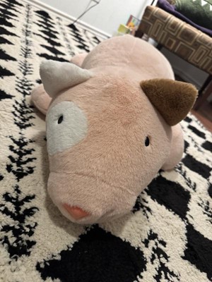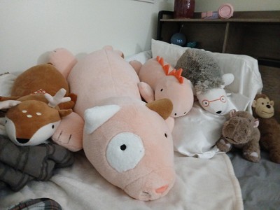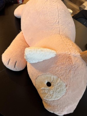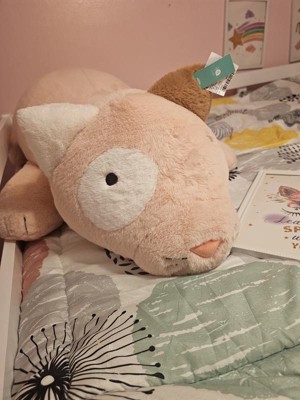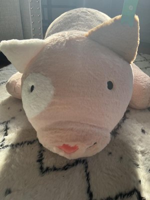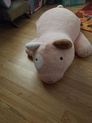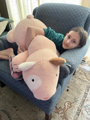 What an adorable giant squish! I’ll admit, the pink color and pointed head make it kind of resemble a pig, so we named it Pig the Cat. It’s about 31 inches long from nose to bottom, and add a few extra inches on for legs. Overall size makes it look like it’s almost as big as my six-year-old. Super super soft and extremely squeezable, my kids can’t resist jumping on it whenever they pass by. It’s softer than a squishmallow, I’d say, from the ones we’ve gotten in the past. Love it!