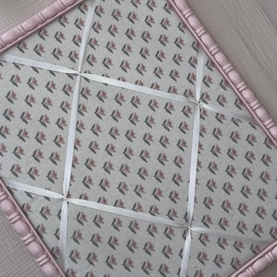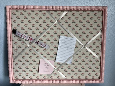 I thought this would be perfect for my daughter’s room - it’s pink, grey, white with floral blooms. But up on the wall the colors aren’t great. The pink is kind of a bright shade and the floral material in the middle has a very tan/cream/brownish color to it which doesn’t look good with grey or white. The floral print is pretty though. Plus it came broken - one entire side is cracked with a piece missing. It does work for pushpins or just sliding pictures under the ribbon though.