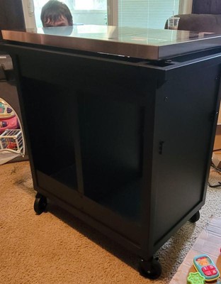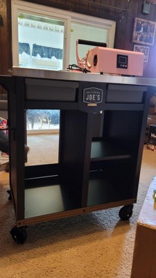 [This review was collected as part of a promotion.] This workstand has a nice stainless steel work area on the top and plenty of room to store things like wood and cooking utensils underneath. The casters are large so they can roll over patio pavers well. I wish one side had a cabinet door to cover clutter a little better but other than that, this is a good cooking aid!
