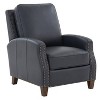 Experience the perfect blend of timeless design and contemporary comfort with our James Push Back Recliner. Upholstered in superior faux leather gel technology, delivering the look and feel of top-grain leather. The tailored track style arms with antique brass nail head accents add a classic touch that complements both traditional and modern interiors. Accented with rich brown solid wood tapered legs, this recliner strikes the perfect balance between style and stability. Sink into the high-density foam seating that ensures superior comfort, making this recliner the go-to spot for relaxation. The manual recline feature smoothly glides to your preferred position, so you can enjoy your downtime with ease. With built-in floor glides, this recliner safeguards your floors from potential scratches, allowing you to move and adjust your seating effortlessly. Elevate your home with the James Push Back Recliner, where comfort, style, and tradition converge seamlessly. Available in your choice of Midnight Blue or Saddle Brown upholstery.