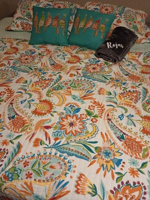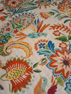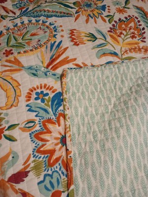 The Maravilla Reversible Quilt Set by Levtex Home is inspired by a beautiful spring garden full of color. Offered in bright floral, this design will immediately transform your bedroom. This reversible quilt features a collection of flowers and paisleys in varying bright colors on a white ground on the front, reversing to a small green fern leaf on a white on the back. The Quilt and Shams have a cotton front and back, filled with a cotton-rich filler and are machine washable. Enjoy this for years to come!