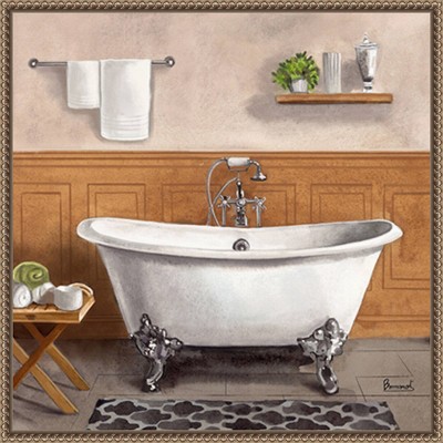 In this artwork, a bright and sunny scene unfolds within a bathroom. A bathtub sits in the center, adorned with lush greenery nearby, creating a serene and inviting atmosphere. A mirror and towel can be seen nearby, adding to the overall ambiance of relaxation and tranquility. This Amanti Art canvas art print was created by Elizabeth Medley and printed by Amanti Art in Madison WI. The canvas is stretched by hand and finished with a float frame. Individually made using traditional custom framing techniques, it has the quality you would expect from your local frame shop. Because of our attention to detail and focus on artistry, architects, interior designers, and homeowners alike choose this framed canvas artwork to create beautiful living spaces.