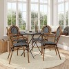 Bring the street vibes of Paris right into your restaurant, bistro, hotel, or backyard patio with this set of four indoor/outdoor commercial grade bistro chairs. The durable PE rattan Thonet-style backs and seats are very comfortable and won't fade when used outdoors. The lightweight, but sturdy, powder coated metal frames hold up to 400 lbs. static weight, and will not rust. Recommended stack height for these chairs is up to 5 high for storage or transport. Two curved arms deliver additional comfort and structure. For your convenience, these chairs arrive completely assembled for instant use and feature floor protector glides to prevent damage to indoor hard flooring surfaces. These dining chairs easily wipe clean with a damp cloth for quick seating turnaround.