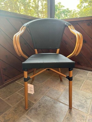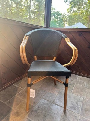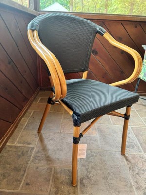 Flash Furniture Marseille Indoor/Outdoor Commercial Bistro Stacking Chair with Arms, Black/White Textilene & Bamboo Print Aluminum Frame in LT Natural